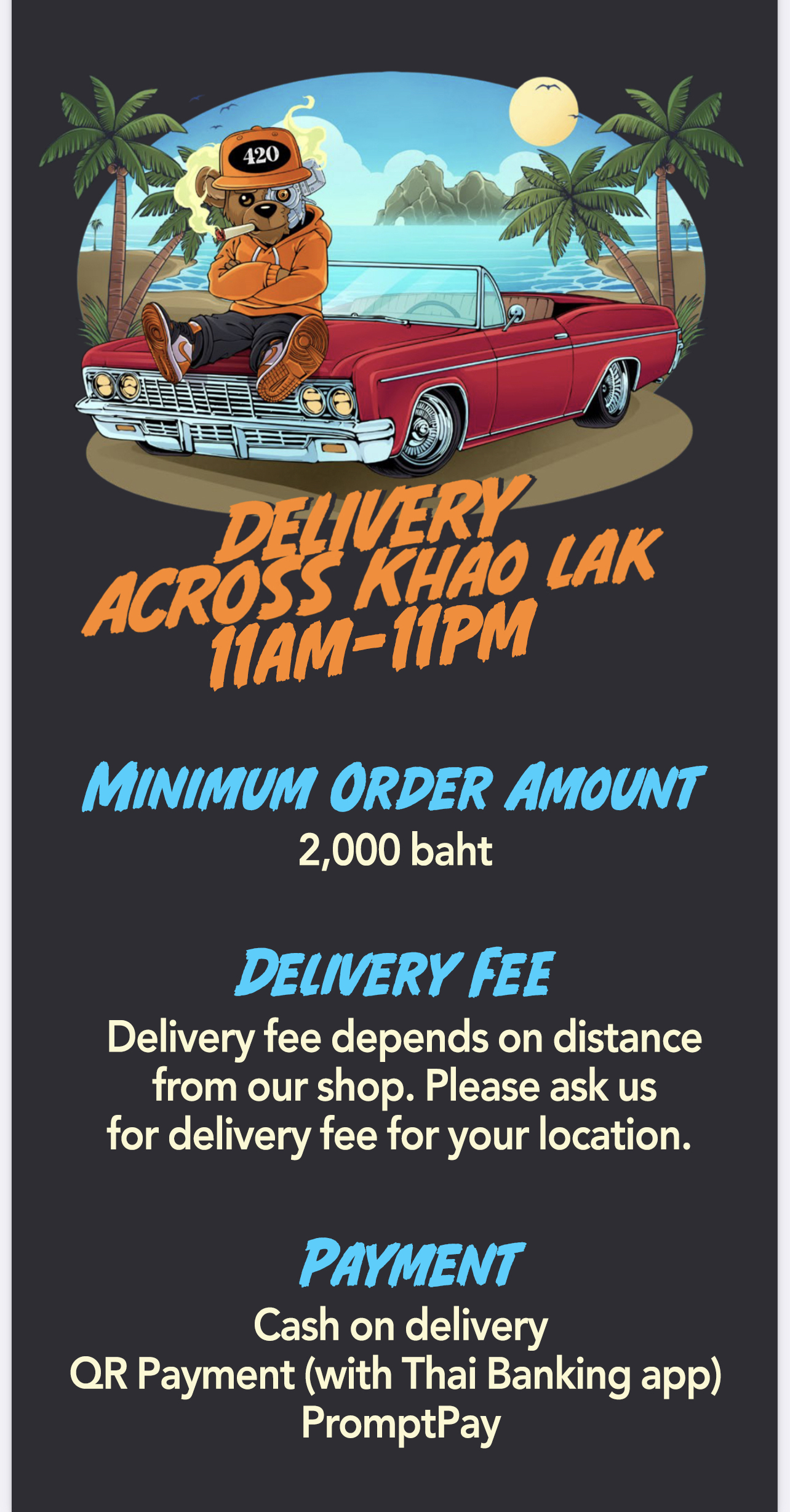 We offer weed delivery across Khao Lak everyday until 11pm. Our professional customer service team are waiting to take your order. We can arrange quick and easy delivery to your home, hotel or villa. Quick, easy, discreet and convenient service every-time.